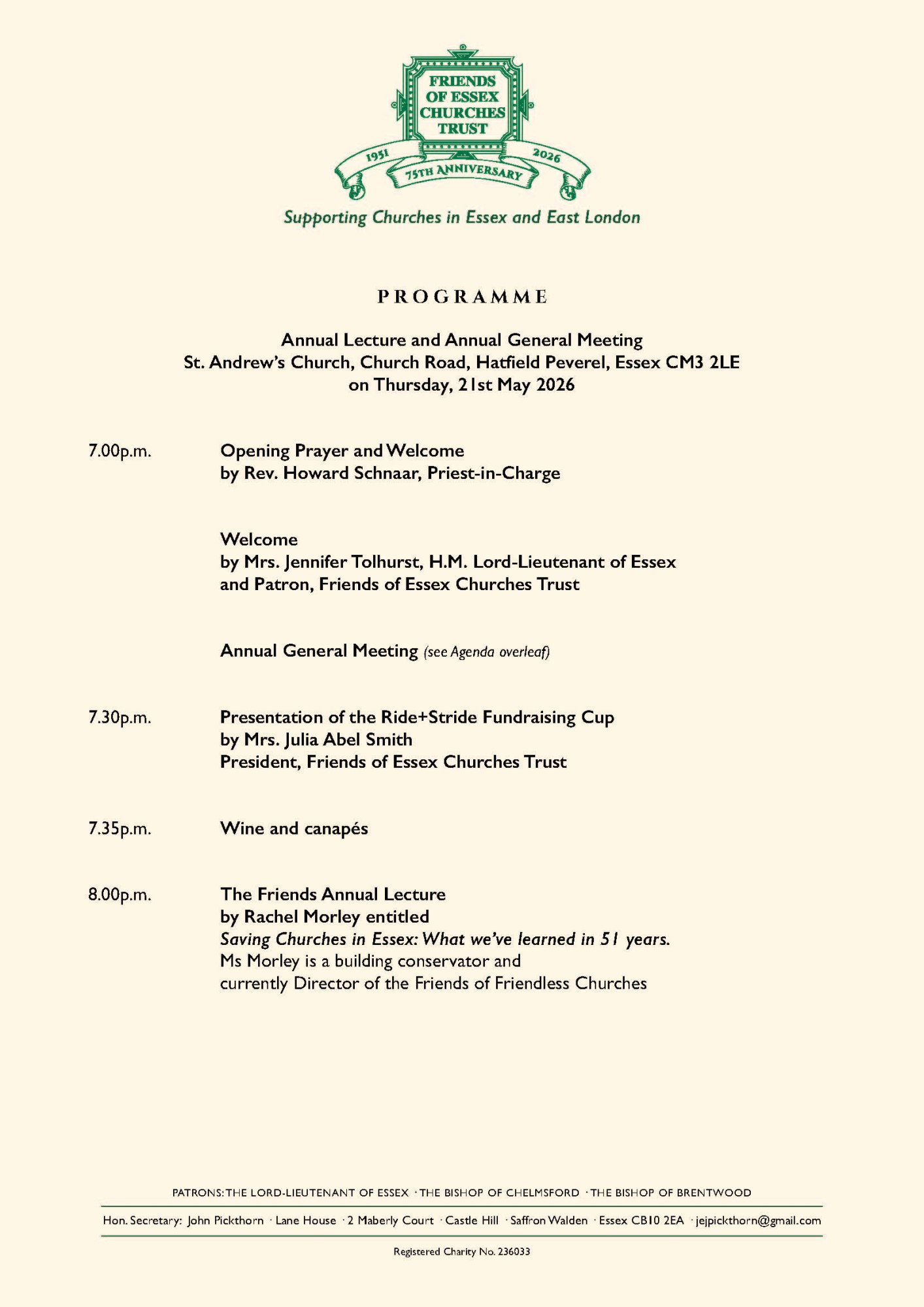 The Friends Annual Lecture and Annual General Meeting and will be held at St. Andrew’s Church, Church Road, Hatfield Peverel, Essex CM3 2LE on Thursday, 21st May 2026.
