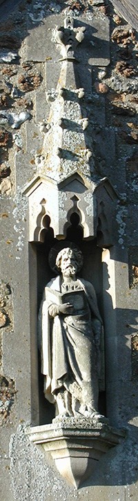 As well as the features already mentioned, there are a number of other items of interest to look out for when visiting the church. On the south side of the nave, at the east end, is a fragment of the rood screen that would have crossed the nave at this point and marked the division between the nave and chancel. There is no record of it, and it was probably taken down at the Reformation. Evidence of stairs that led up to the rood loft on top of the screen survived until the north aisle was built in 1878. Above the pulpit on the north side are three fragments of plaster that carry traces of 15th-century painting. Now very indistinct, it is said to have depicted adoring angels and archangels. In the north aisle is a rubbing of a memorial brass to Elizabeth Coke (died 1606) and her daughter, also Elizabeth; they both came to live in Great Totham in 1599. The brass itself is at the foot of the sanctuary step, but is mostly hidden by the choir stalls and carpet. By the font is a painting of the Adoration of the Magi, which hung behind the altar until the present reredos was installed in 1949. Little is known about it except that it was given by Mrs Frances Lee of Maldon and is said to have come from the chapel at Messing House. Finally, notice two depictions of St Peter, the church’s patron saint. The first is in the stained glass window on the south side of the chancel, dated 1878, and shows him holding the keys of Heaven. The second is the statue on the outside wall of the vestry. The keys can be seen here also, on the cover of the book he has in his right hand, but in his left hand he is holding a fish – a reminder that he was a fisherman before becoming a ‘fisher of men’.